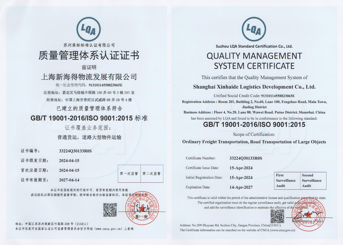 新海得物流嚴格按現(xiàn)代物流操作流程進行標準化運作。已通過國際質(zhì)量管理體系ISO9001:2015體系認證。運用健全的客戶服務(wù)管理系統(tǒng)、車輛管理系統(tǒng),財務(wù)管理系統(tǒng)。在查詢、監(jiān)控、追蹤、結(jié)算等方面與客戶做到無縫對接,打造了專業(yè)高效的客戶服務(wù)體系。